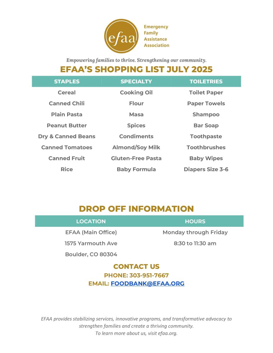 What to bring: It's a potluck picnic. Add your favorite dish or beverage to this shared meal. Also, please bring a canned food item or any item on the list attached for a drive for EFAA clients. Plates, flatware, and napkins will be provided.